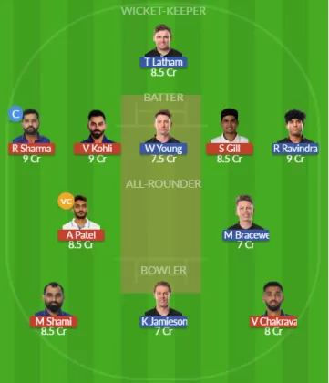 IND vs NZ Dream11 Team: KL Rahul, Virat Kohli, Kane Williamson (vc), Rachin Ravindra, Shreyas Iyer, Shubman Gill (c), Axar Patel, Mitchell Santner, Glenn Phillips, Matt Henry, Varun Chakravarthy.