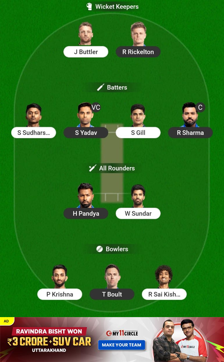 MI vs GT Dream11 Team: Jos Buttler, Ryan Rickelton, Rohit Sharma, Suryakumar Yadav, Sai Sudharsan, Shubman Gill, Hardik Pandya, Jasprit Bumrah, Trent Boult, Prasidh Krishna, Rashid Khan.