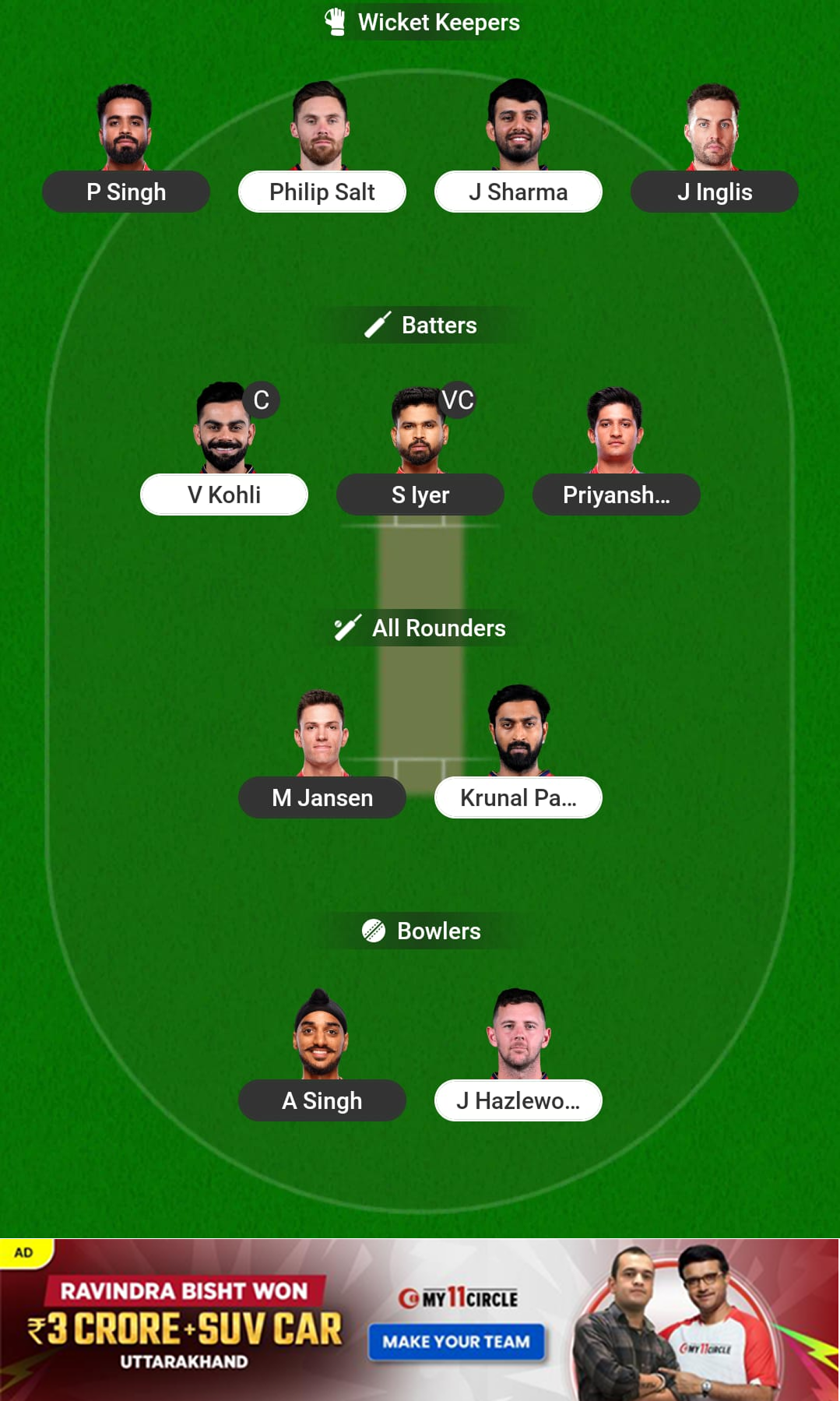• Jitesh Sharma will lead the RCB as a Captain. He was the highest fantasy points gainer in the previous match.